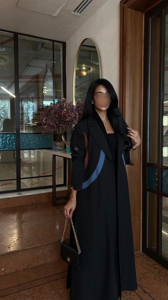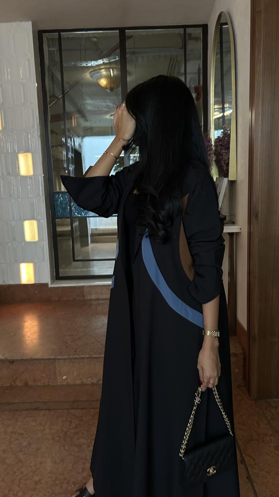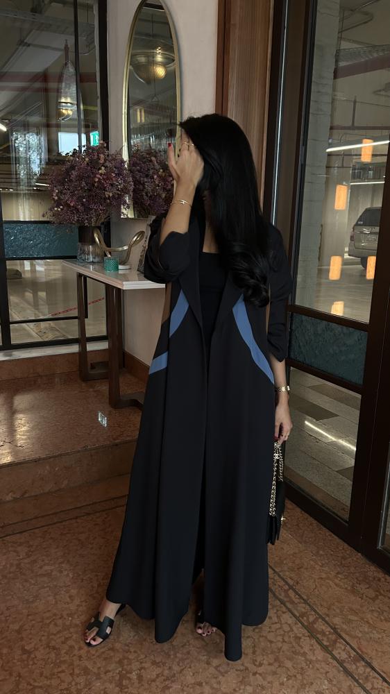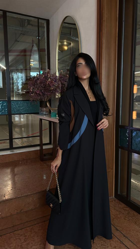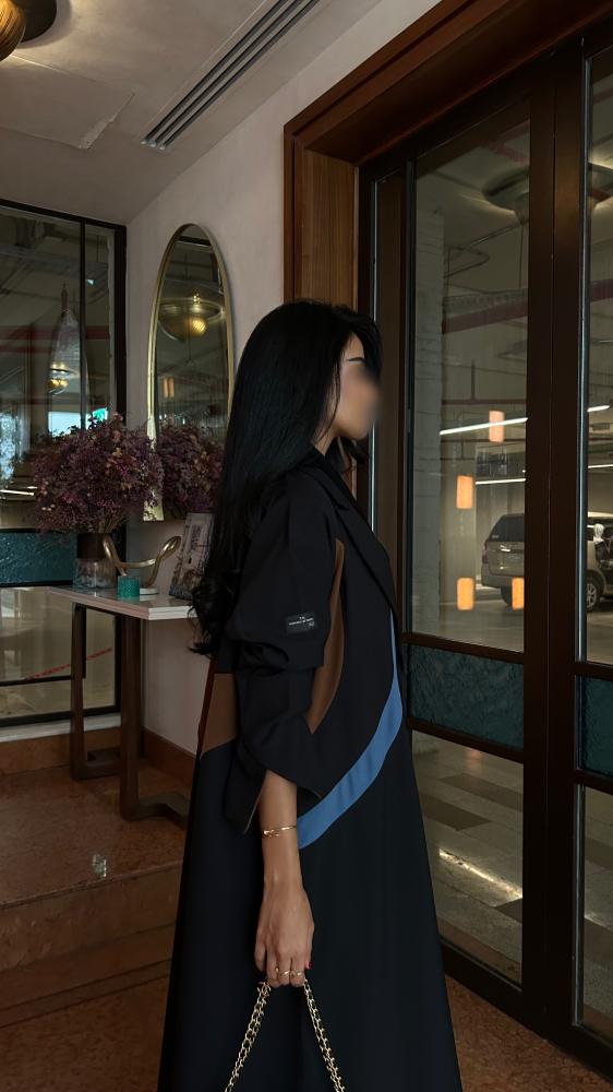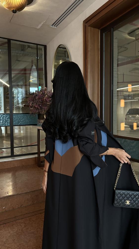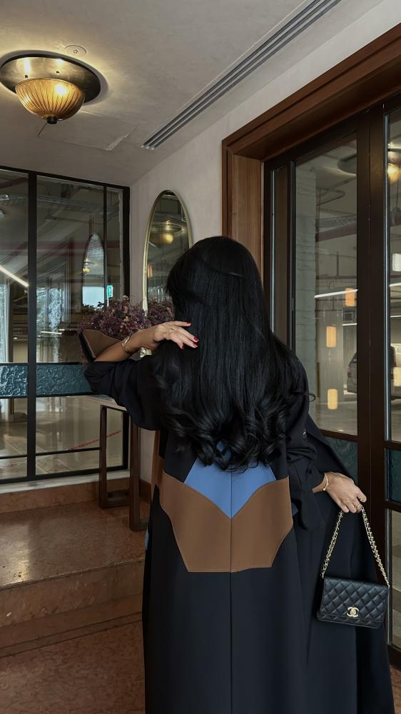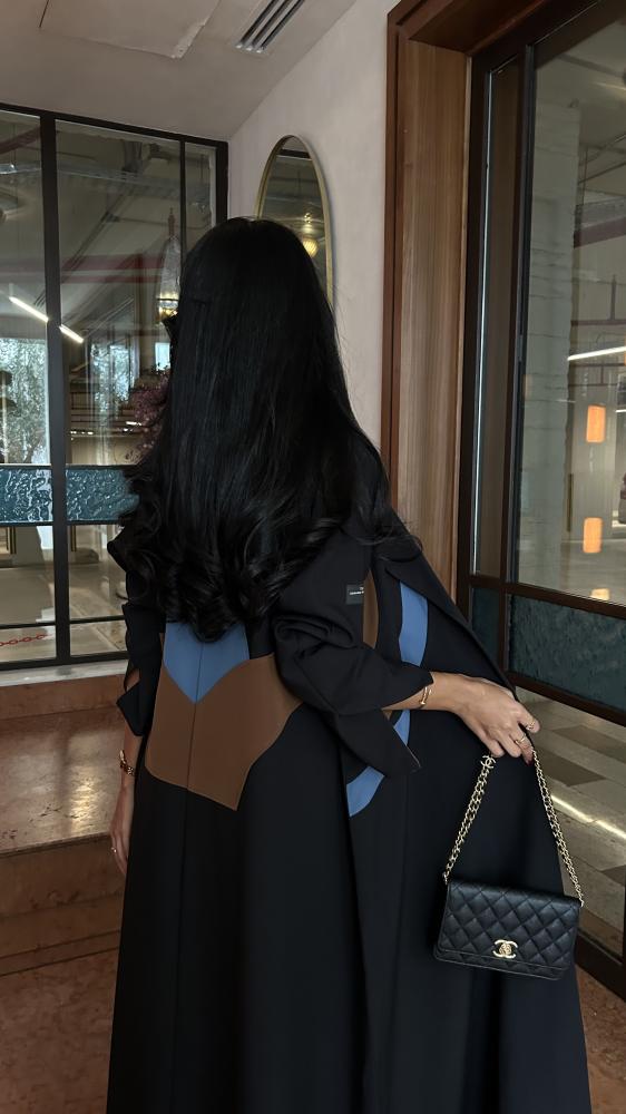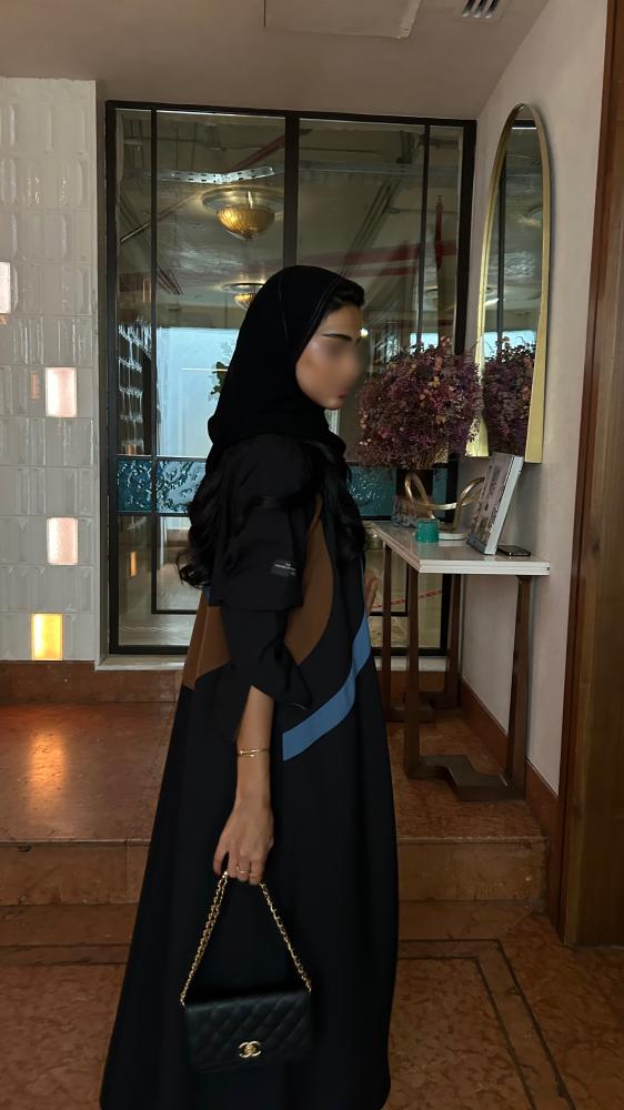 التفاصيل: عباية كريب اسود، قصة مثلث من الخلف بكريب اندونيسي بلون بني وسماوي، قصة كلوش، طرحة دقة بني وسماوي.