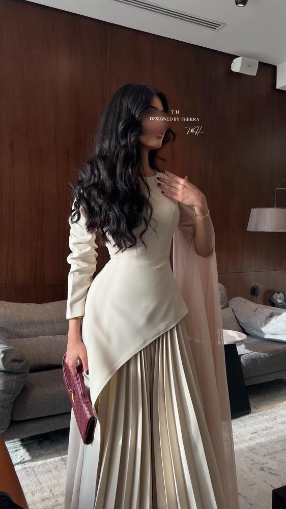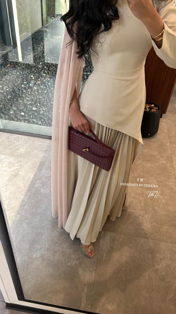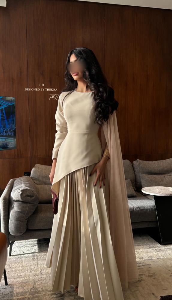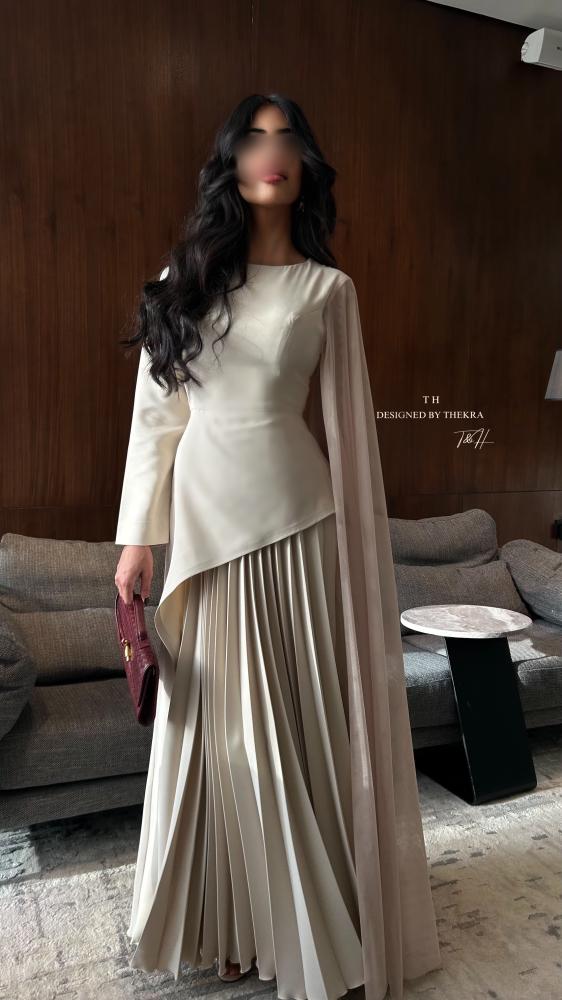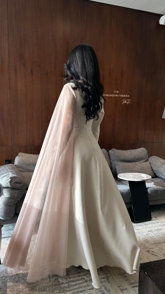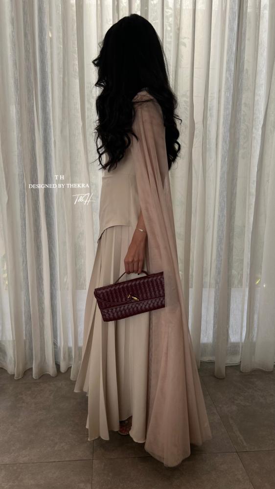 جلابية بيج من قماش الكريب الاندونيسي الفاخر، بتكسير داخلي وكم طويل من التل البيجمقاس المودل: سمول- طول 57طول المودل: 168cm