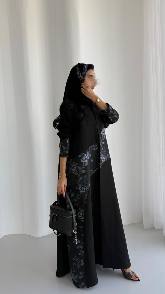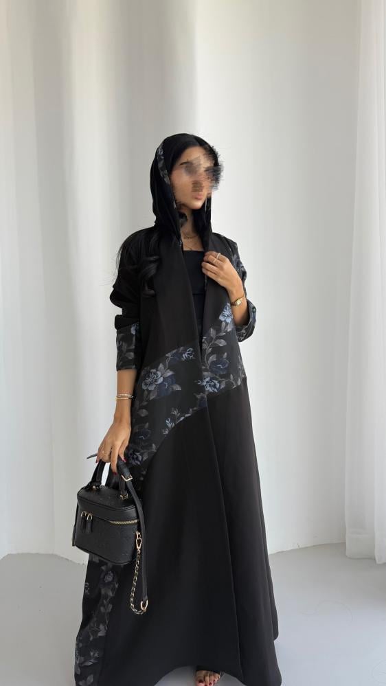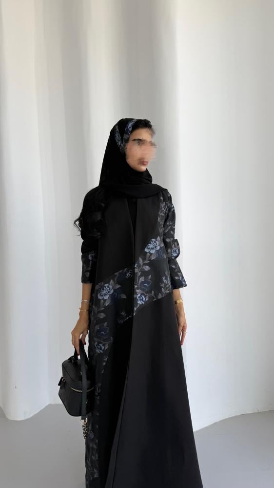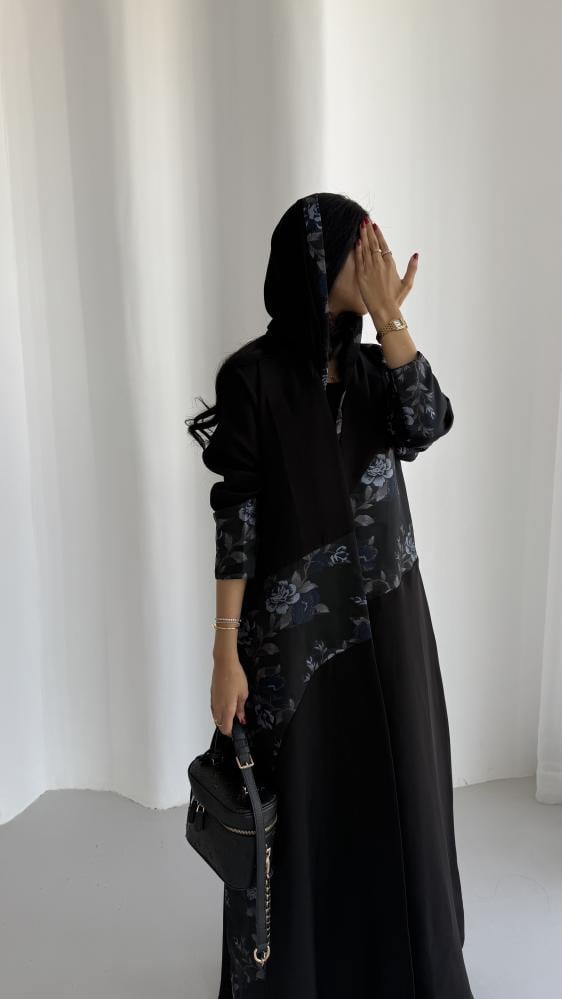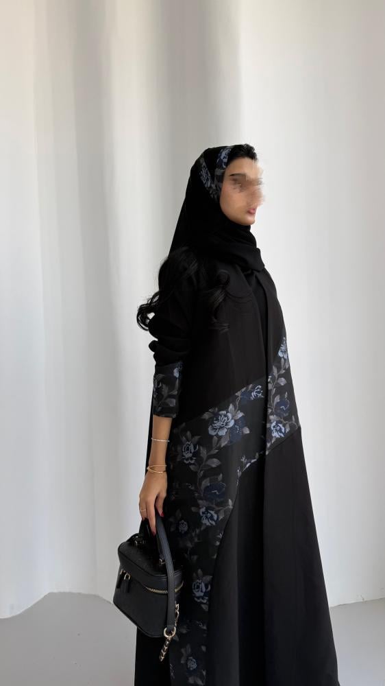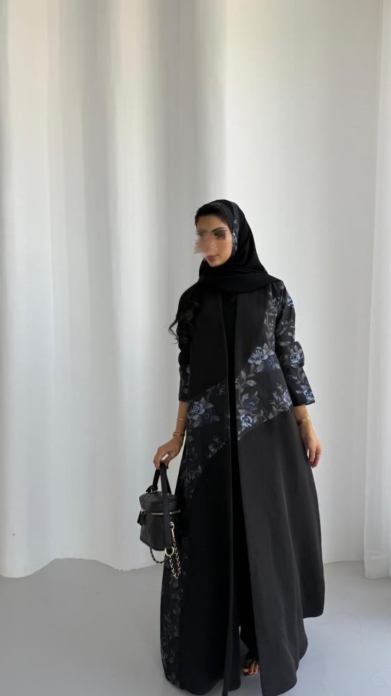 التفاصيـل: عباية قصة كلوش كريب اسود، من النصف قماش جاكار منقش بورد كحلي، طرحة طرف قماش منقش بورود كحلية.