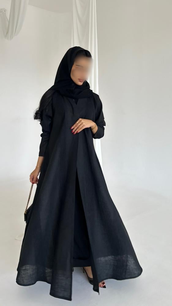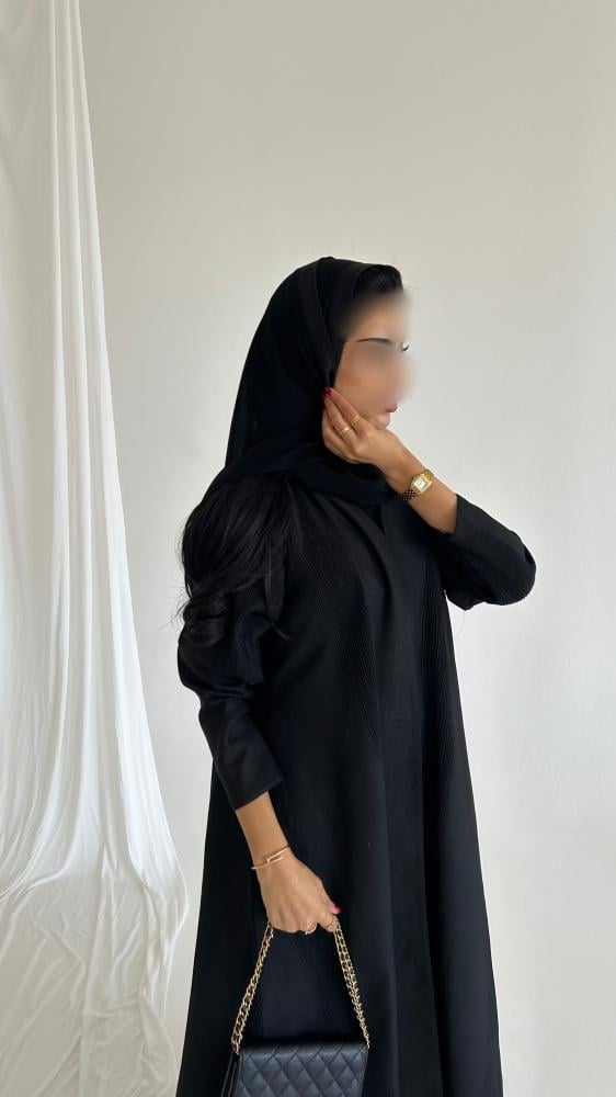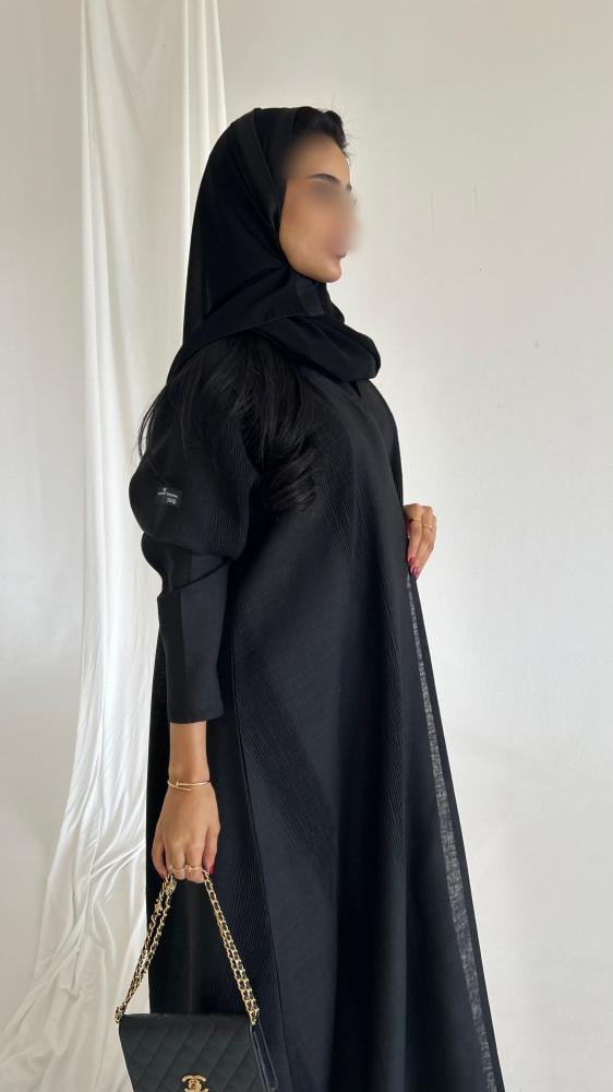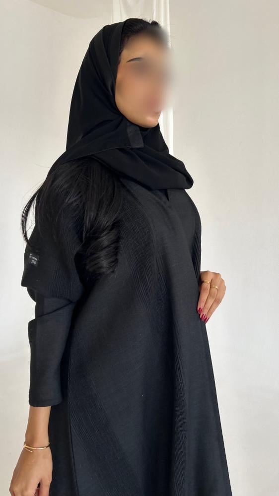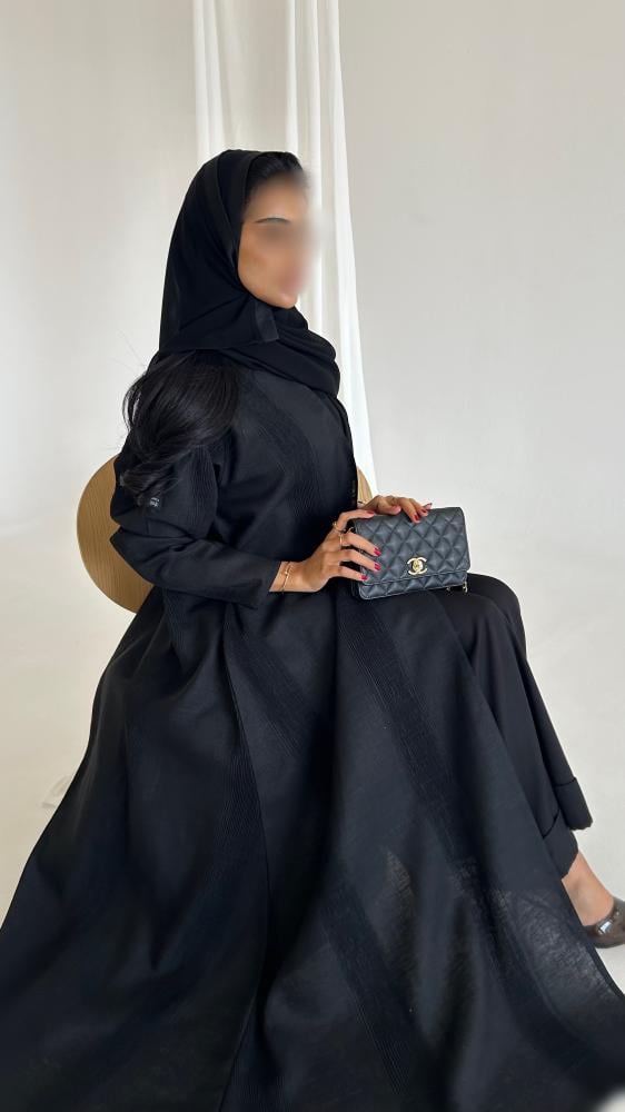 التفاصيـل: عباية من قماش اللينن الاسود مبطن بشيفون، المزيّن بكسرات على كامل العباية، قصة كلوش، طرحة طرف لينن.-كمية محدودة-