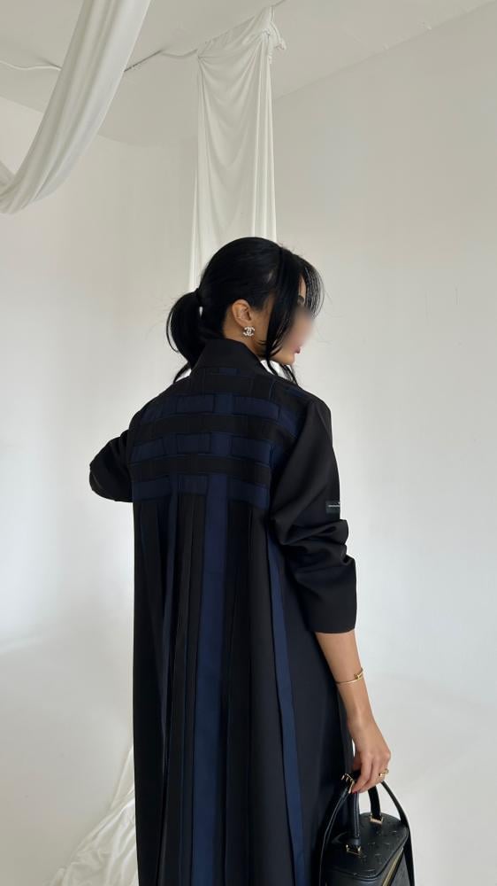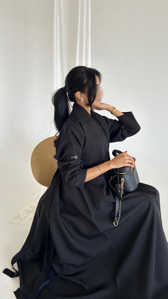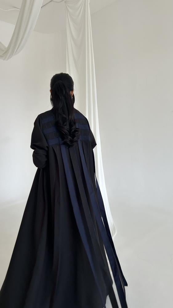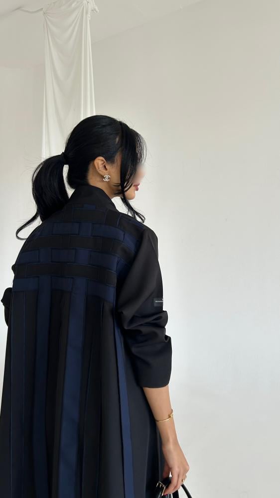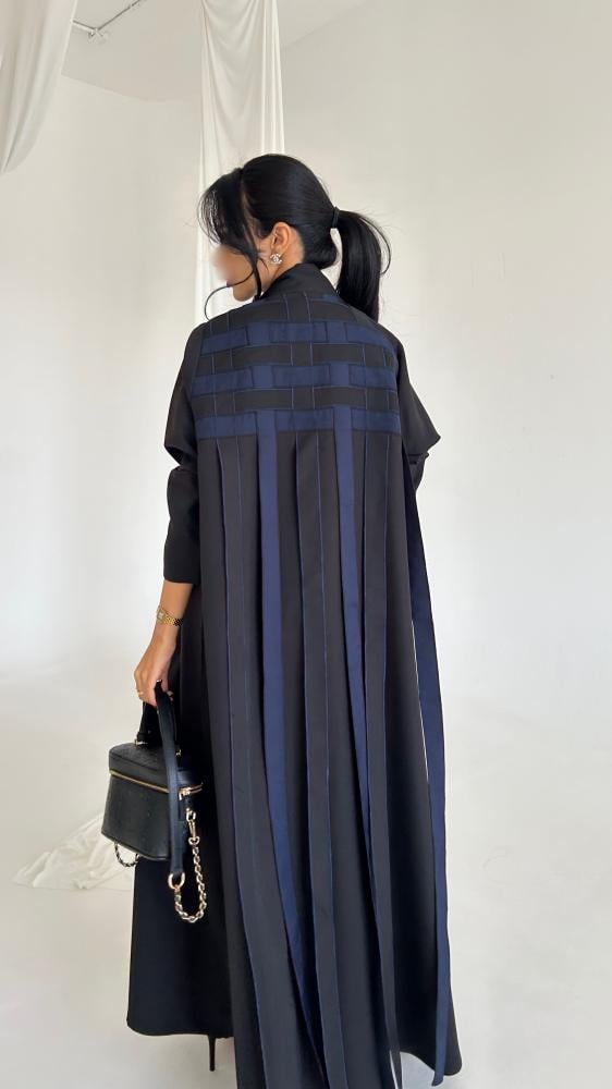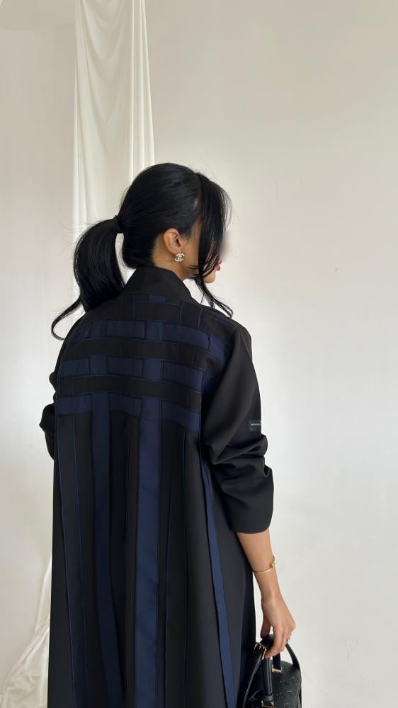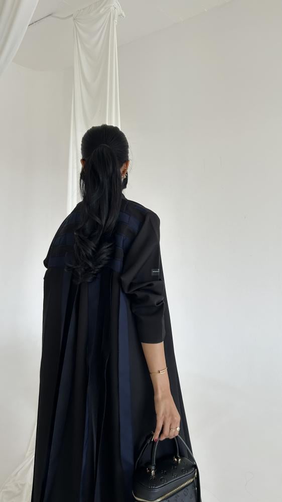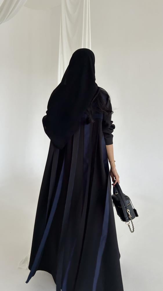 التفاصيـل: عباية كريب اسود مزيّنة من الخلف من قماش الكريب الكحلي، طرحة طرف كحلي، قصة كلوش.