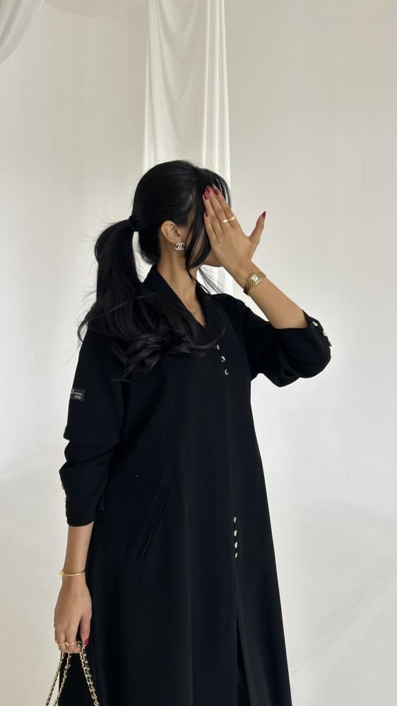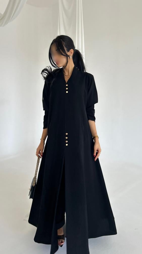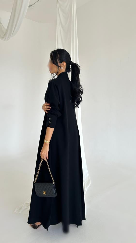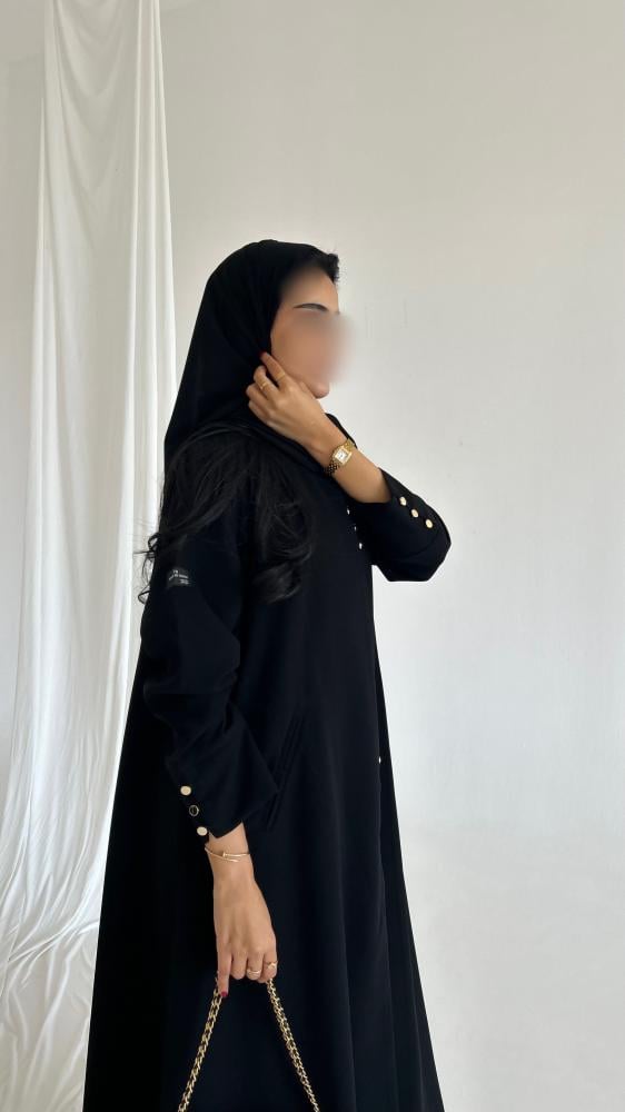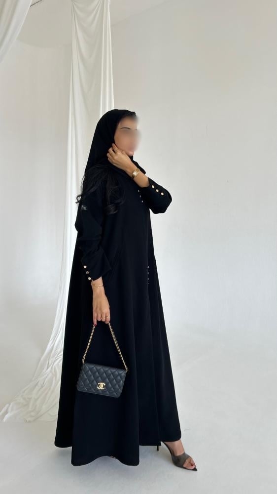 التفاصيـل : عباية كريب اسود فاحم، تُغلق بأزرار ذهبي من الامام والأكمام، قصة كلوش، طرحة اسود سادة، الرجاء الاطلاع على جدول القياس.