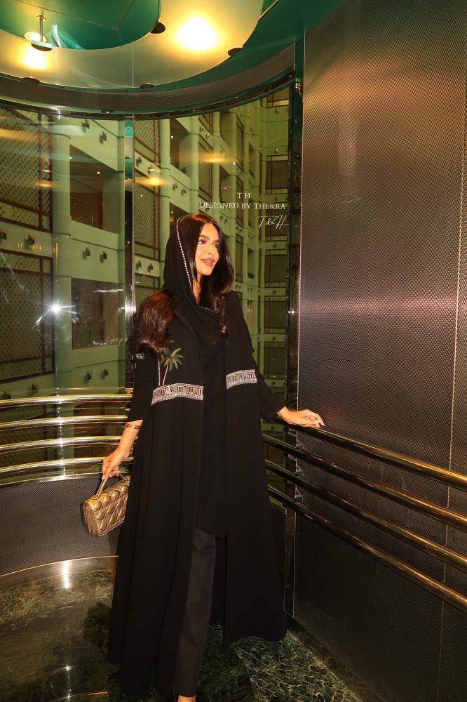 التفاصيـل: عباية كريب أسود فاحم، قصة كلوش، تزيّنها نخلة مطرزة بتفاصيل تراثية أصيلة، تحمل في ملامحها رمزية الخير والعطاء، وتستحضر عبق الهوية السعودية في تصميم يجمع بين الفخامة والجذور.