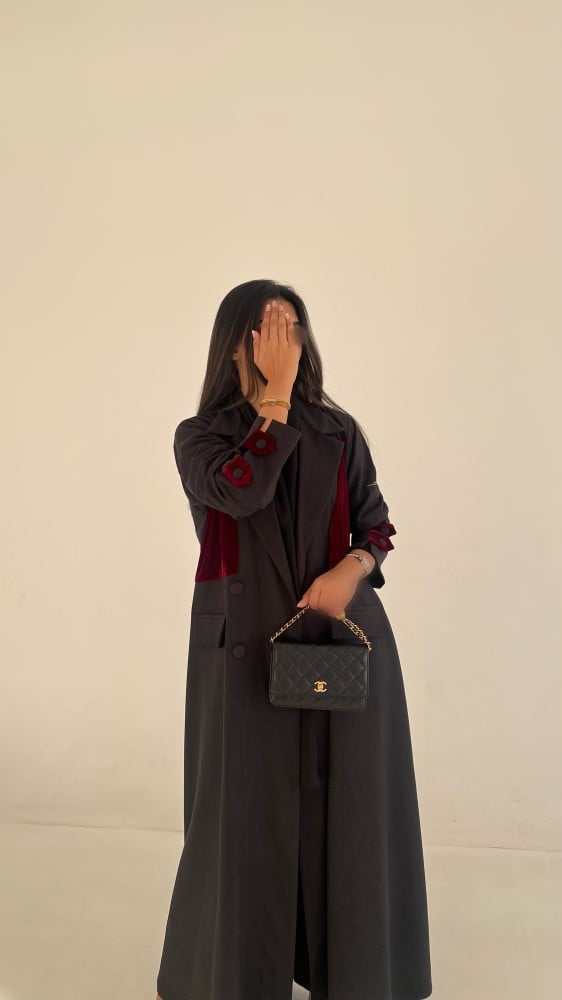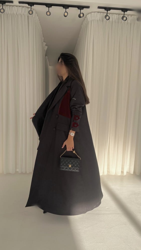 القماش: جوخ ناعم - مخملاللون: رصاصي غامق- عنابي غامقالقصة: كلوشطرحة رصاصي غامق طرف عنابيتم تغيير لون القماش عن المعروض (رصاصي افتح بدرجتين)