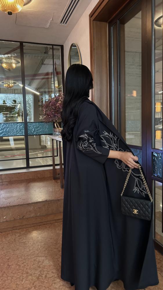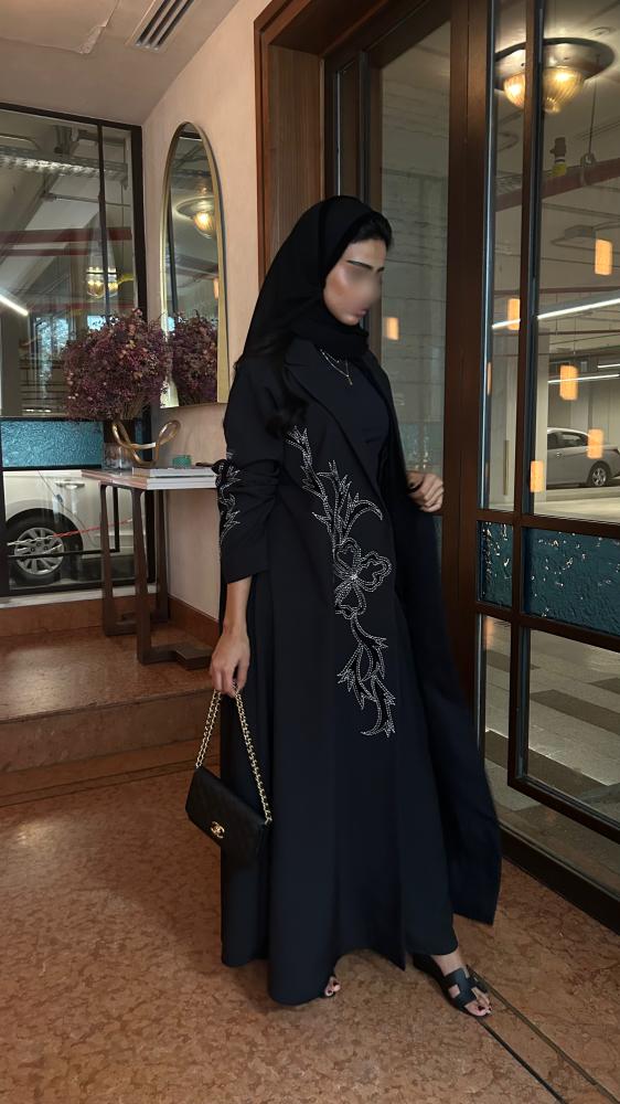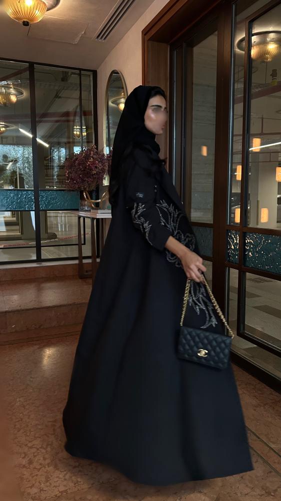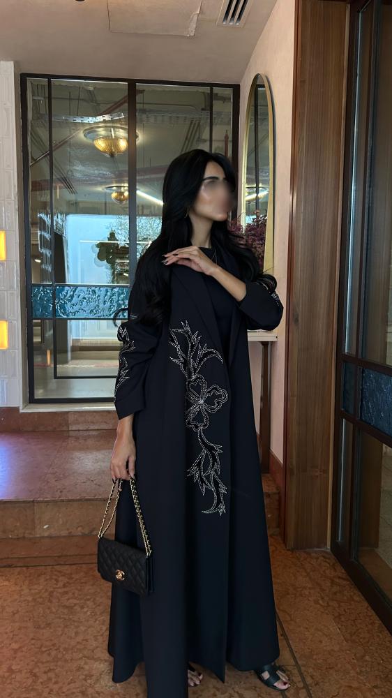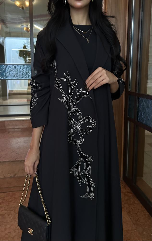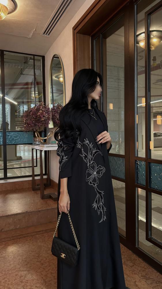 التفاصيـل: عباية قماش كريب اسود، تطريز يدوي شكل ورد مخمل اسود بأطراف لون رمادي، طرحة طرف قماش مخمل