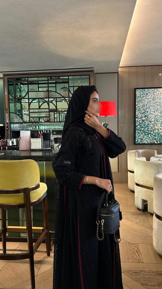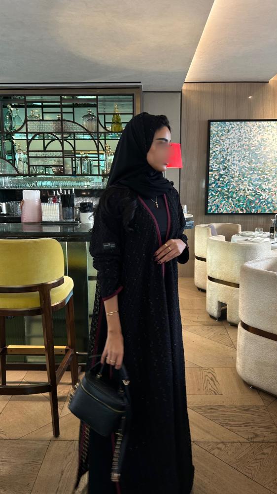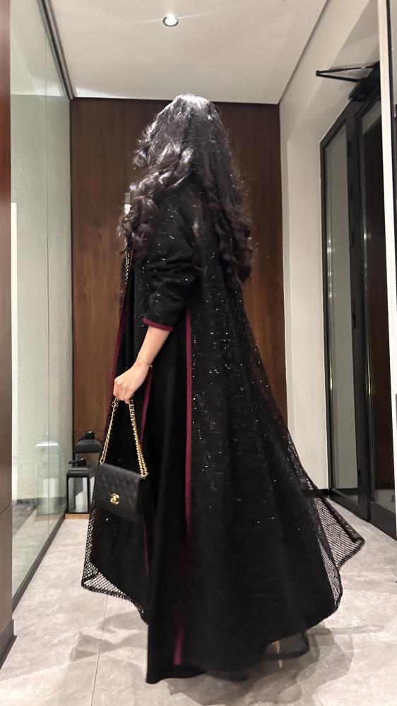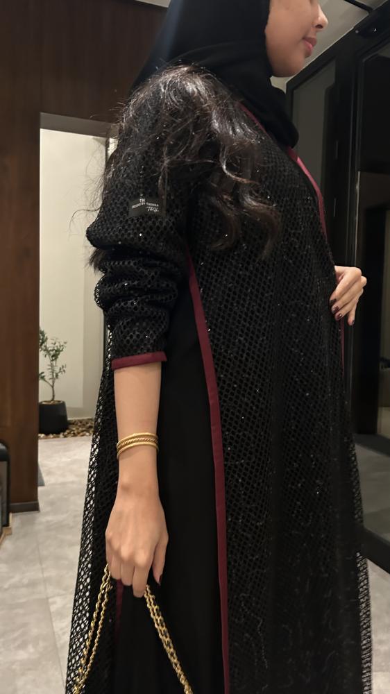 التفاصيل: عباية قصات قماش شبكة اسود بلمعة مطفية، وبطانة اسود ناعم بأطراف عنابية، قصة كلوش، طرحة طرف نفس القماش
