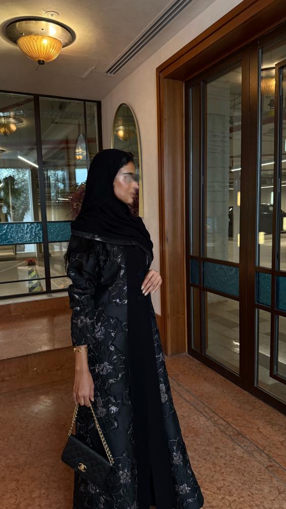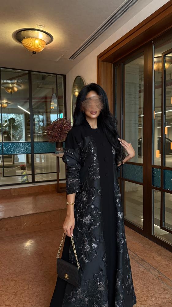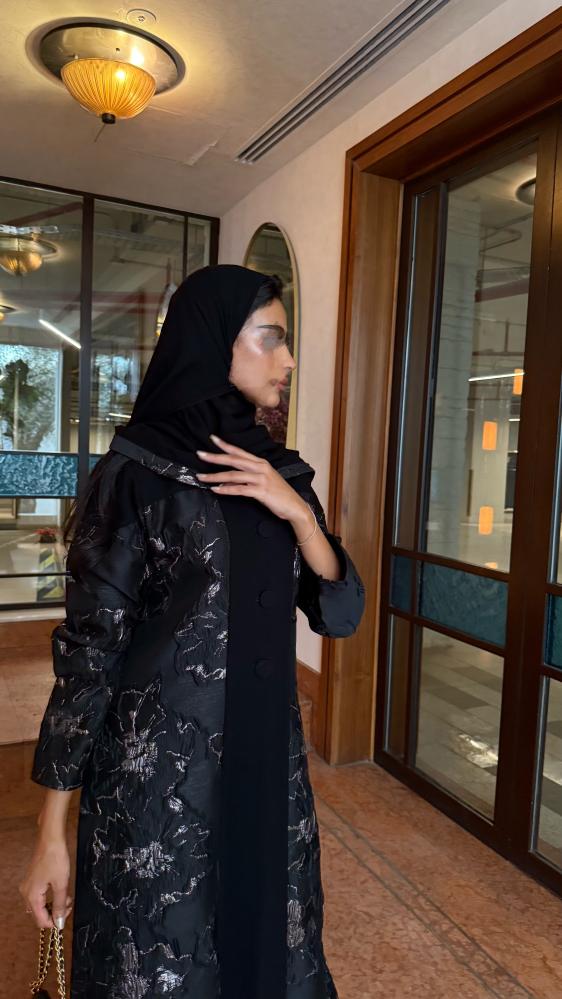 التفاصيـل: عباية من قماش الكريب الأسود الفاحم، وقماش تفتة موّرد من الأطراف، مغلقة بأزرار قصة A Line، طرحة طرف قماش تفتة