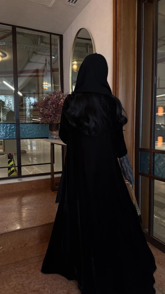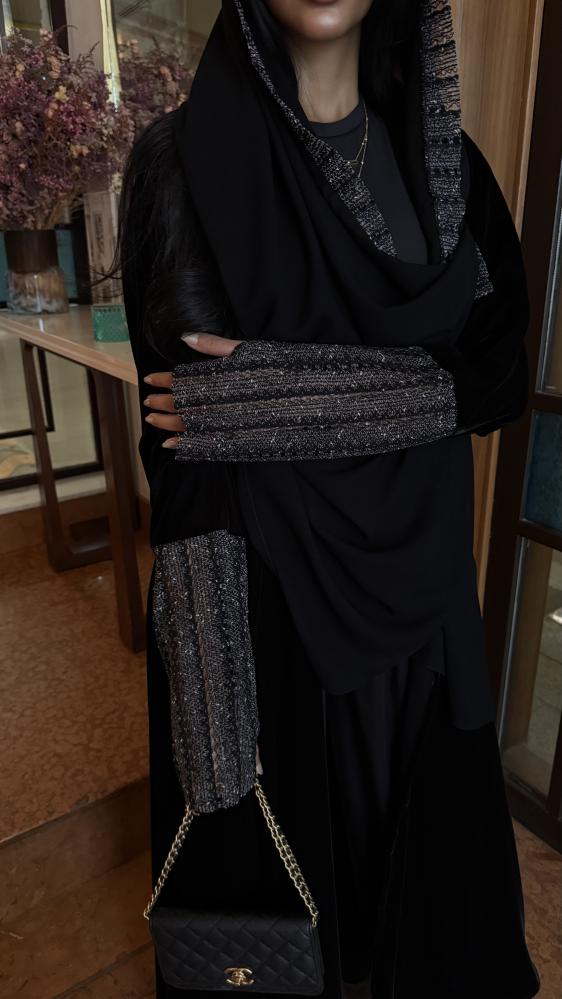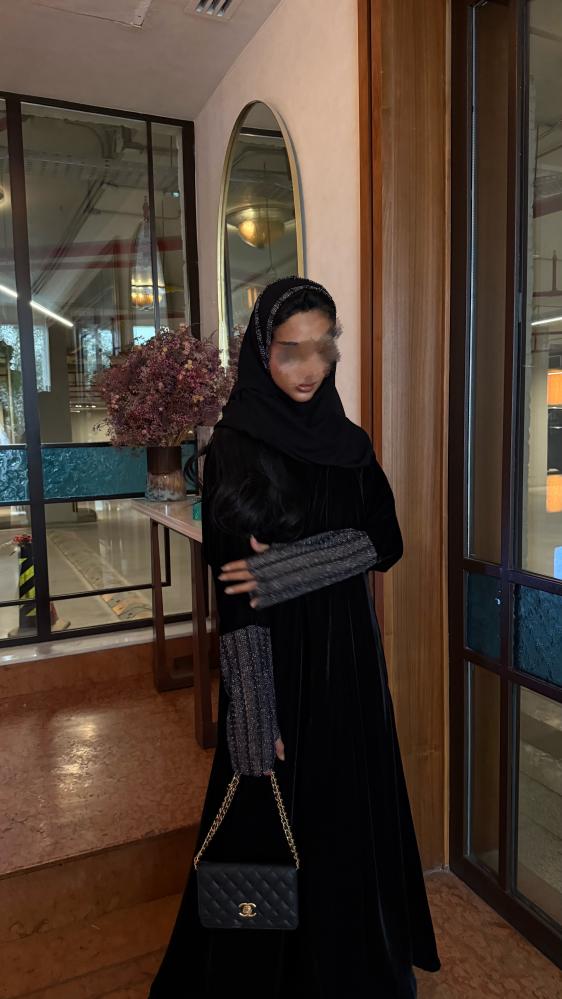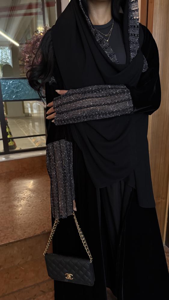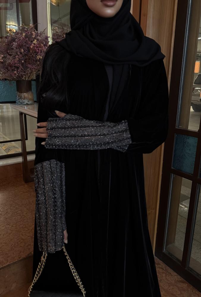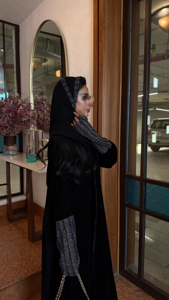 التفاصيـل: عباية كريب مخمل كوري، مبطن بطانة كوري شيفون، قصة كلوش، كم قماش شبك لامع بفتحة اصبع غير مبطن، طرحة طرف قماش شبكة لامع.