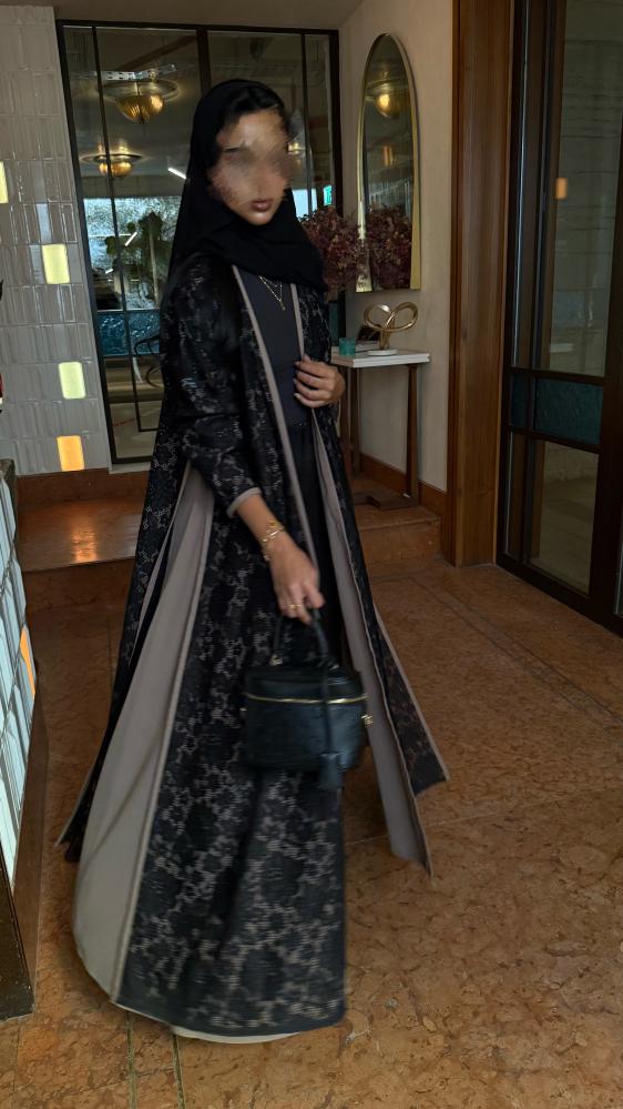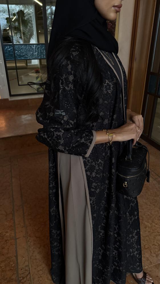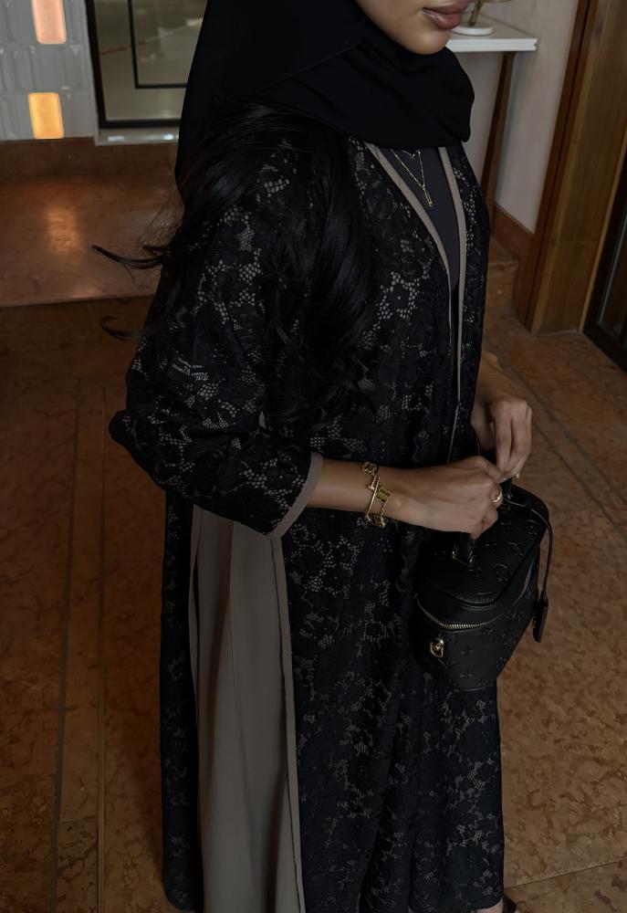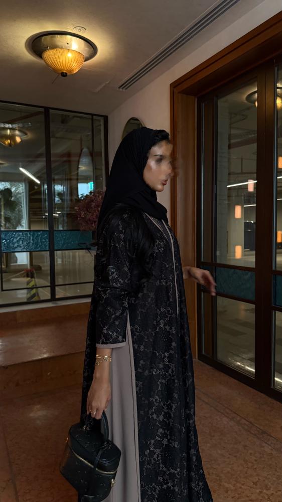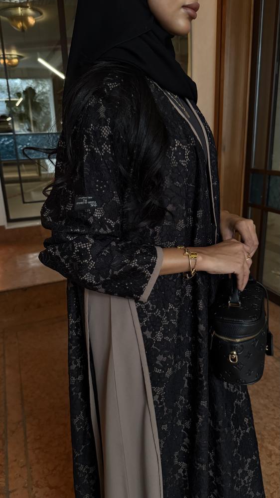 التفاصيـل: عباية دانتيل منقش برسمة بارزة، مبطن بقماش بيج، وقيطان بيج على أكمام واطراف العباية، قصة كلوش، طرحة طرف دانتيل.